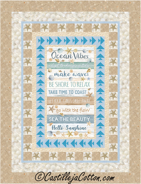 Fun beach vibes quilt pattern uses a panel (size 24" x 44"). Fabric shown in the sample quilt is Timeless Treasures Fabric Take Me Away **