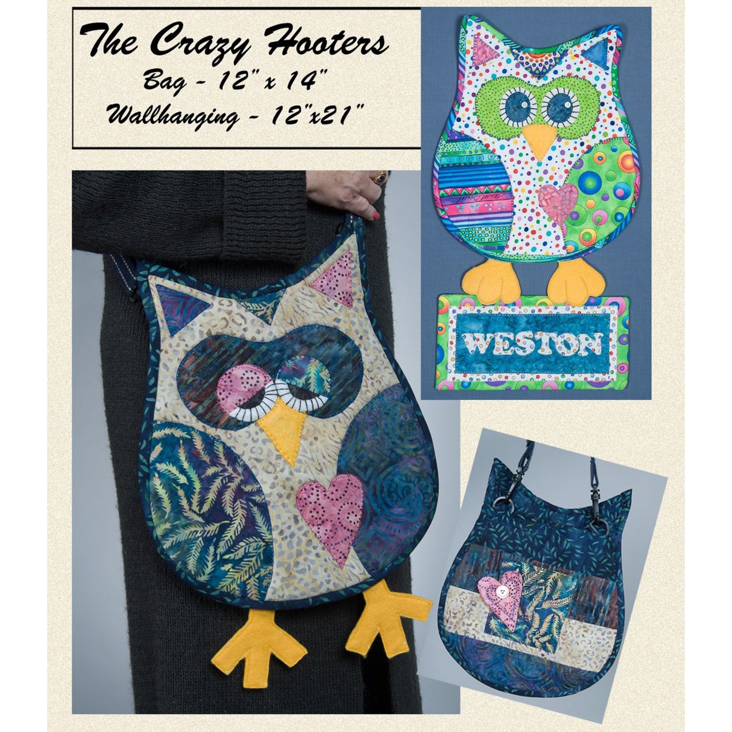 Whooooo wouldn't love these "Crazy Hooters"? This funky owl bag pattern will tickle your funny bone and elicit lots of laughs. Make him with eyes wide opened or falling asleep; with two choices of feet or no feet at all. The pattern includes an outside pocket, inside divided pocket, inside zippered pocket and adjustable straps.