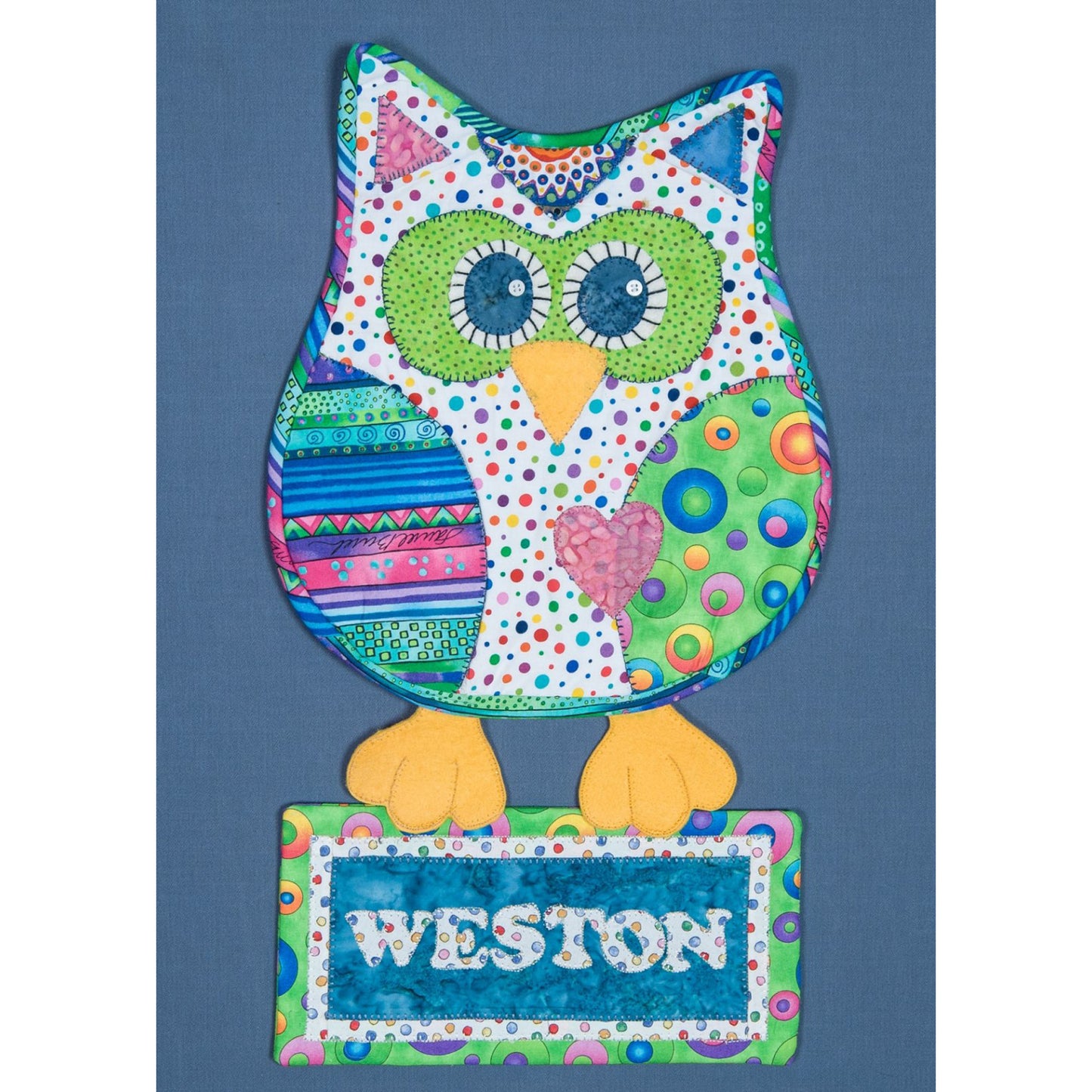 The colorful Weston owl wall hanging pattern was made for Mary's new grandson. The instructions include full sized diagrams and alphabet to personalize your plaque.
