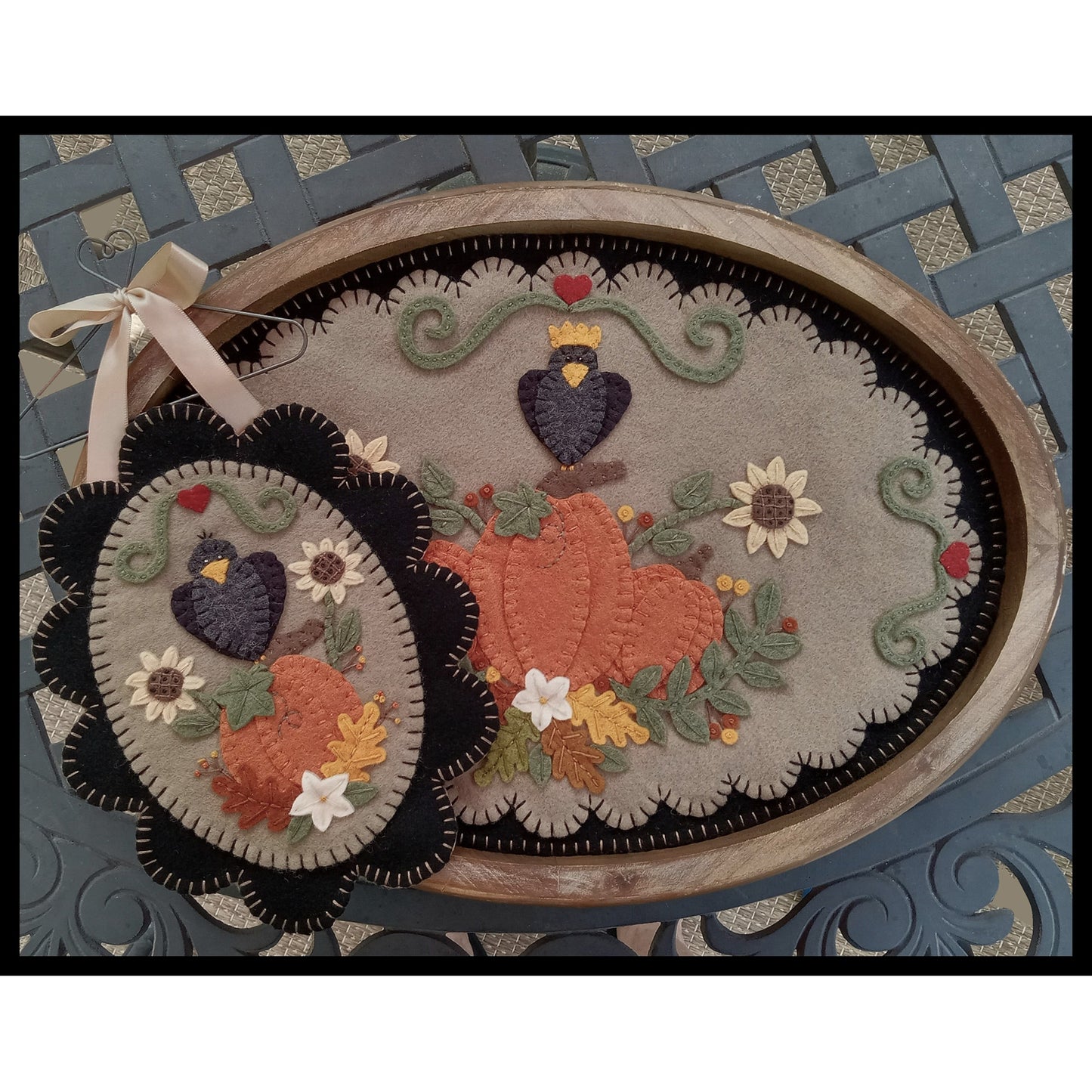 This whimsical Autumn set is so much fun to create and even more fun to display! Add the crown or just a few little tufts of 'feathers'. Either way, this little crow is simply adorable! The completed table mat measures approximately 10 1/2 by 15 inches and the mini mat measures 7 by 9 inches. Stitch them up using wool, wool felt, or even bamboo felt and enjoy all season long!