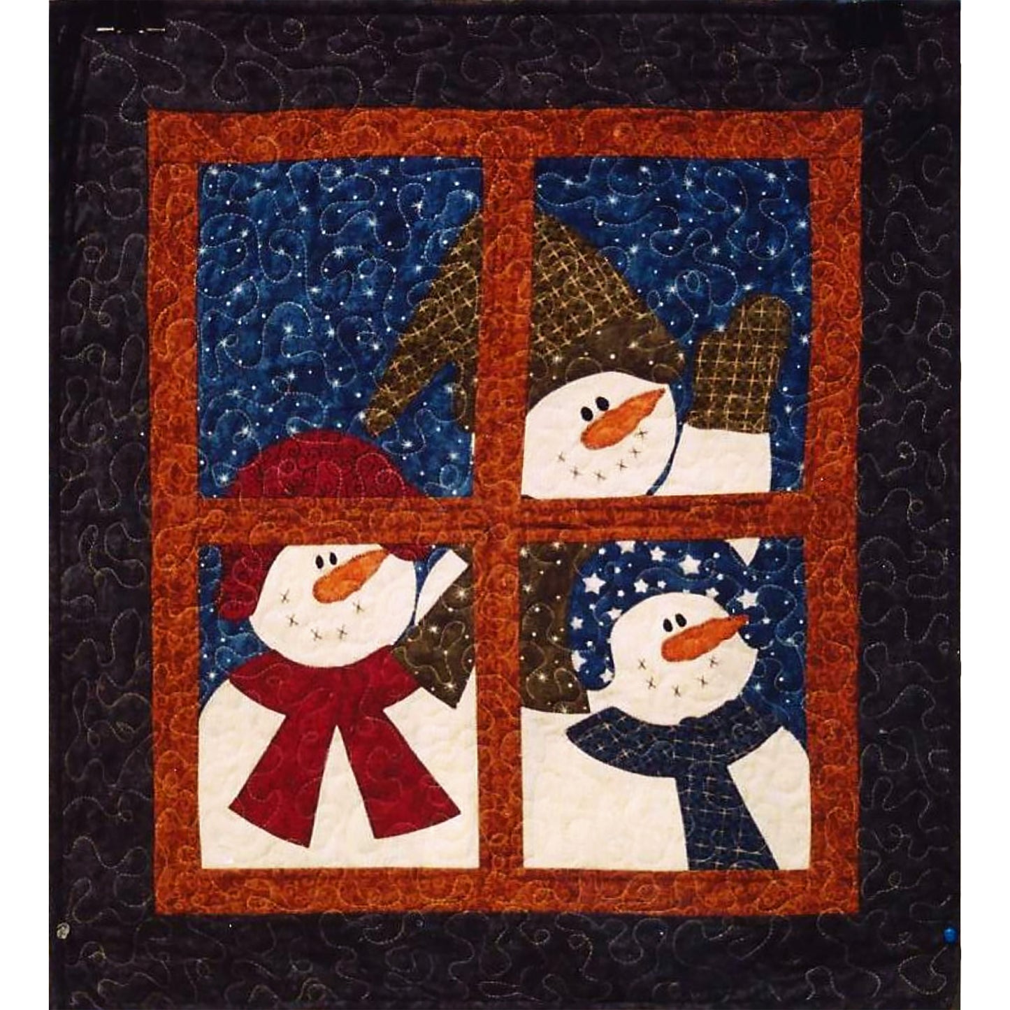 Through the Winter Window (otherwise known as the Peeking Snowmen Pattern) features three adorable applique snowmen on a quilted wall hanging. Perfect for your winter decorations or for adding holiday cheer to your Christmas festivities.