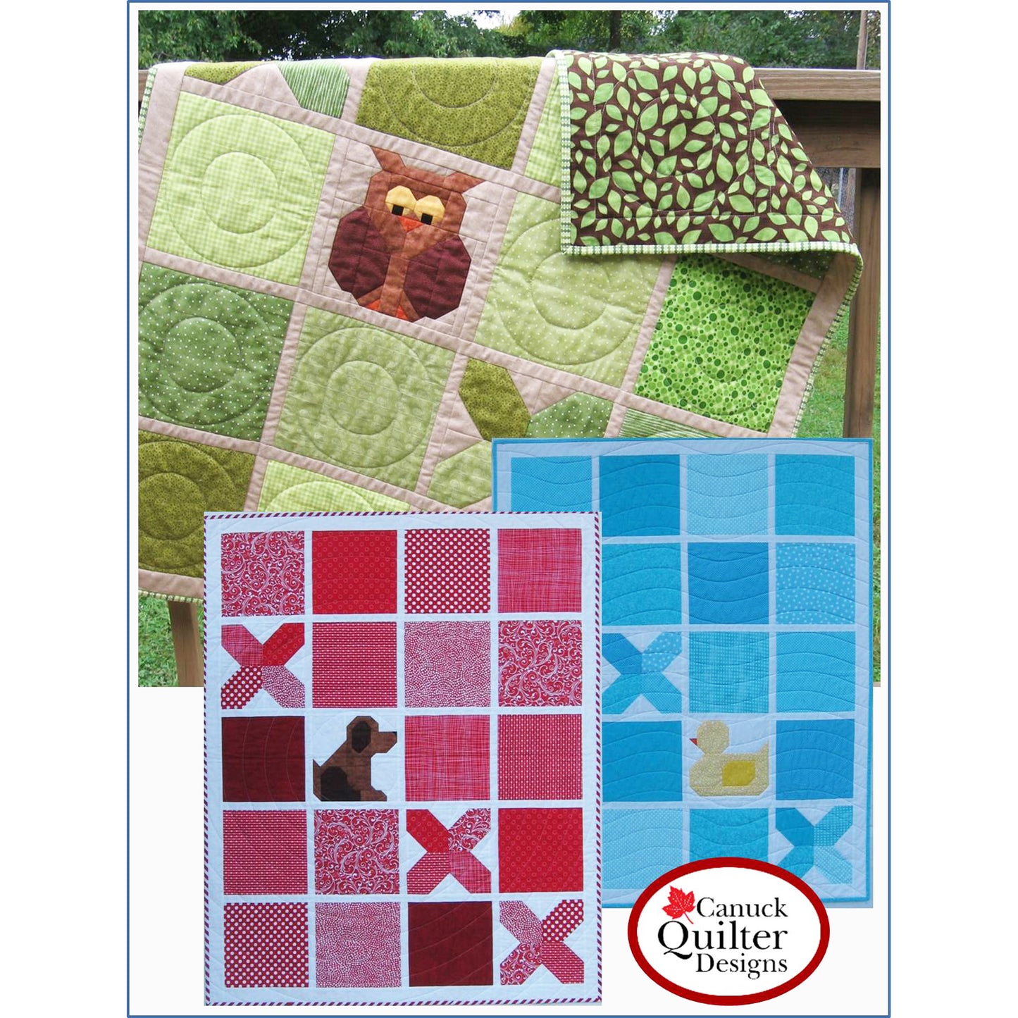 Combine simple X-blocks and print squares with one of three animal blocks for a sweet and simple baby quilt pattern. There are no triangles to cut and no paper piecing to construct this charming quilt pattern.
