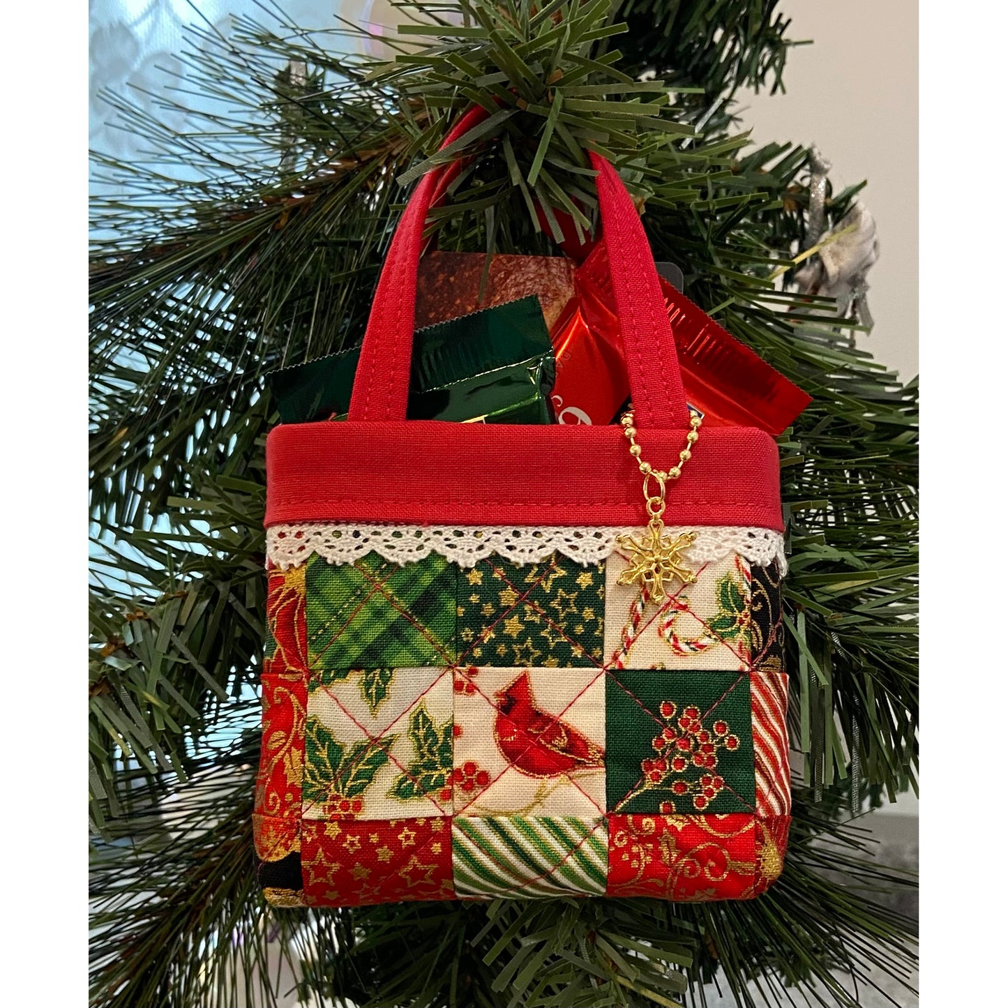 Stitch a set of holiday tiny tote bags to give as gifts or decorate your tree. This fun quilting project will fascinate your friends and family. Patchwork is made from 5" charm squares, add trim and snowflake charms to complete the look. Size 5 1/2" tall by 4" wide. Makes 10