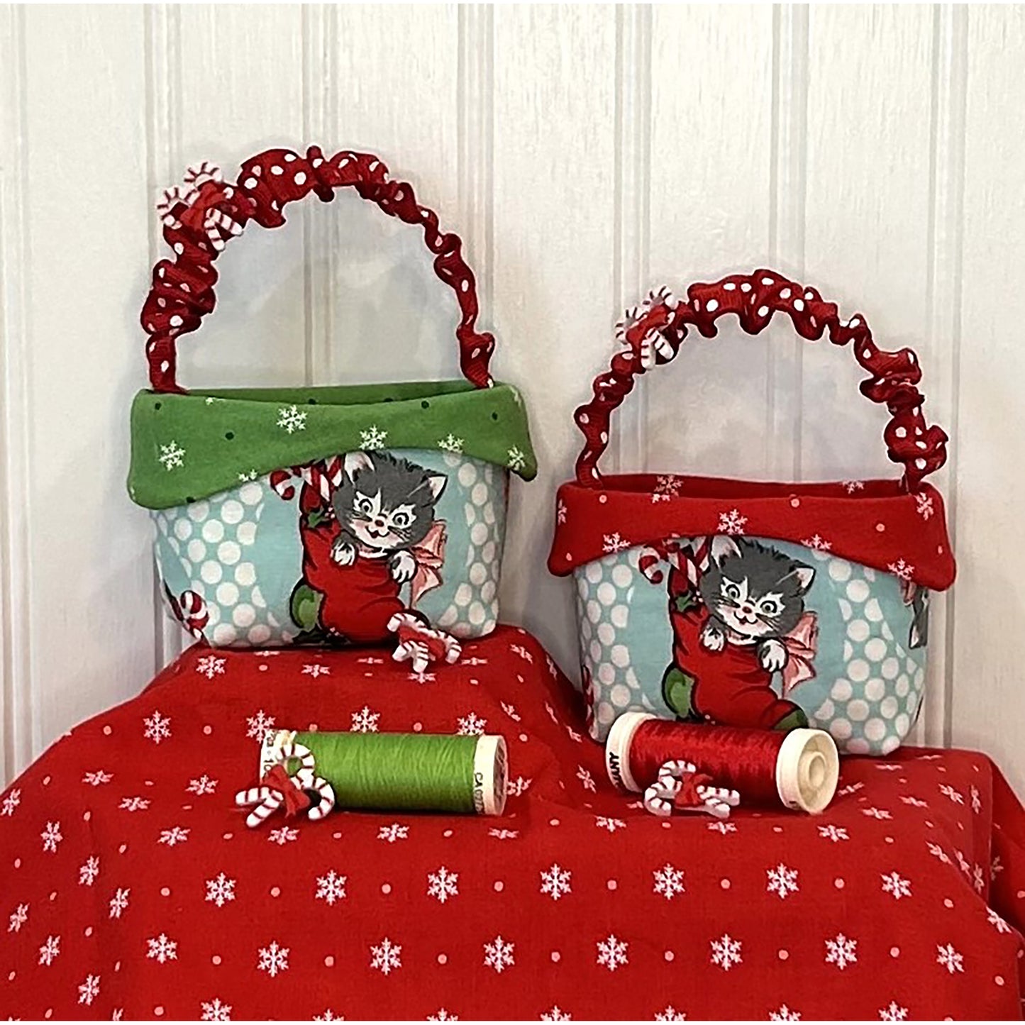 Stitch festive Tiny Treat Baskets from tiny border prints or holiday prints. Fully lined with a pocket that holds a gift card. Makes 4. size 4" x 4 1/2" including handles. This is a beginner friendly stitching project that will amaze your friends and family. They are fun to make and fast to stitch.