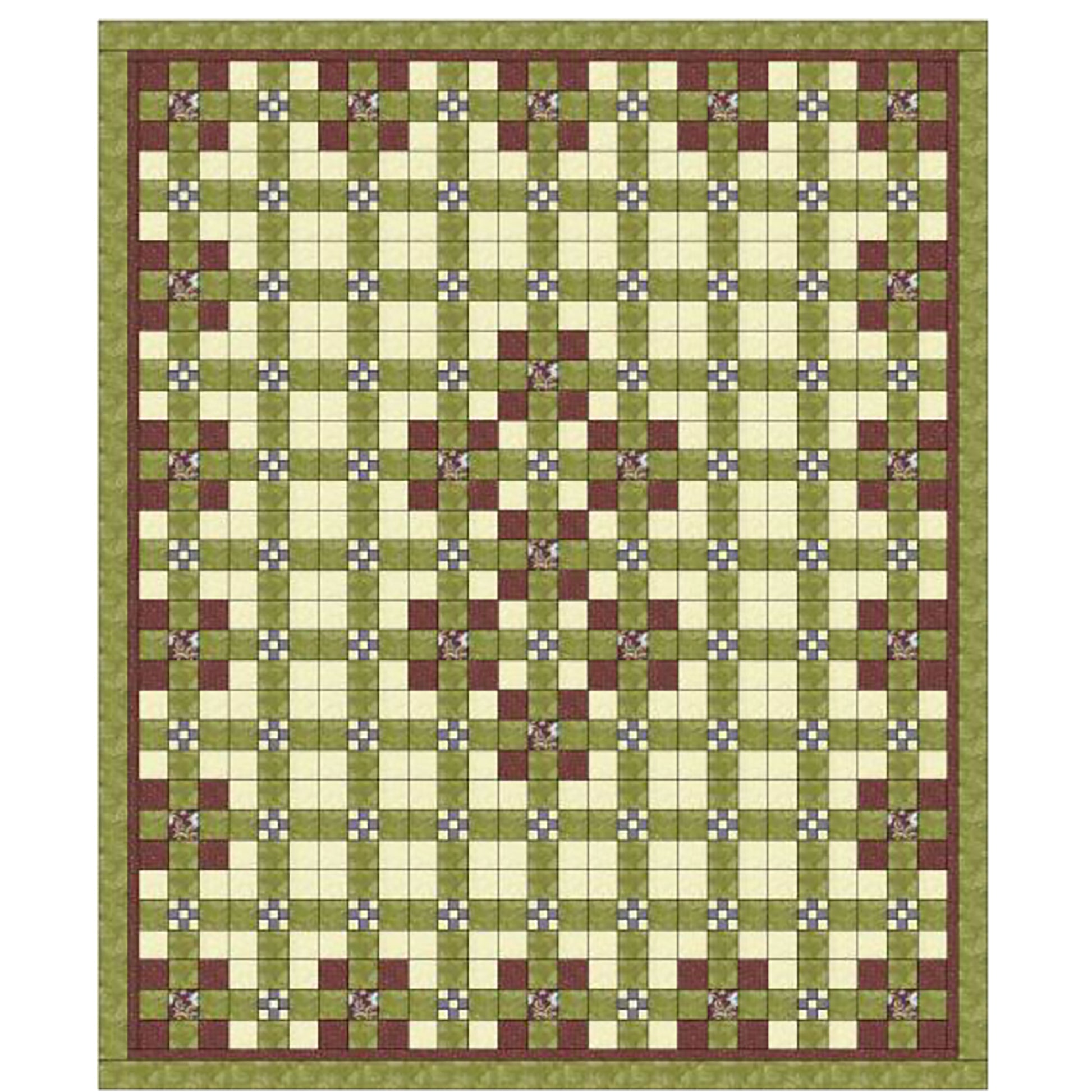 This quilt pattern is an easily pieced nine patch within a nine patch. The color placement gives it the look of a tile floor. A variation can be made by substituting fussy cut fabric motifs for some of the nine patches. The throw size can be made in a weekend.