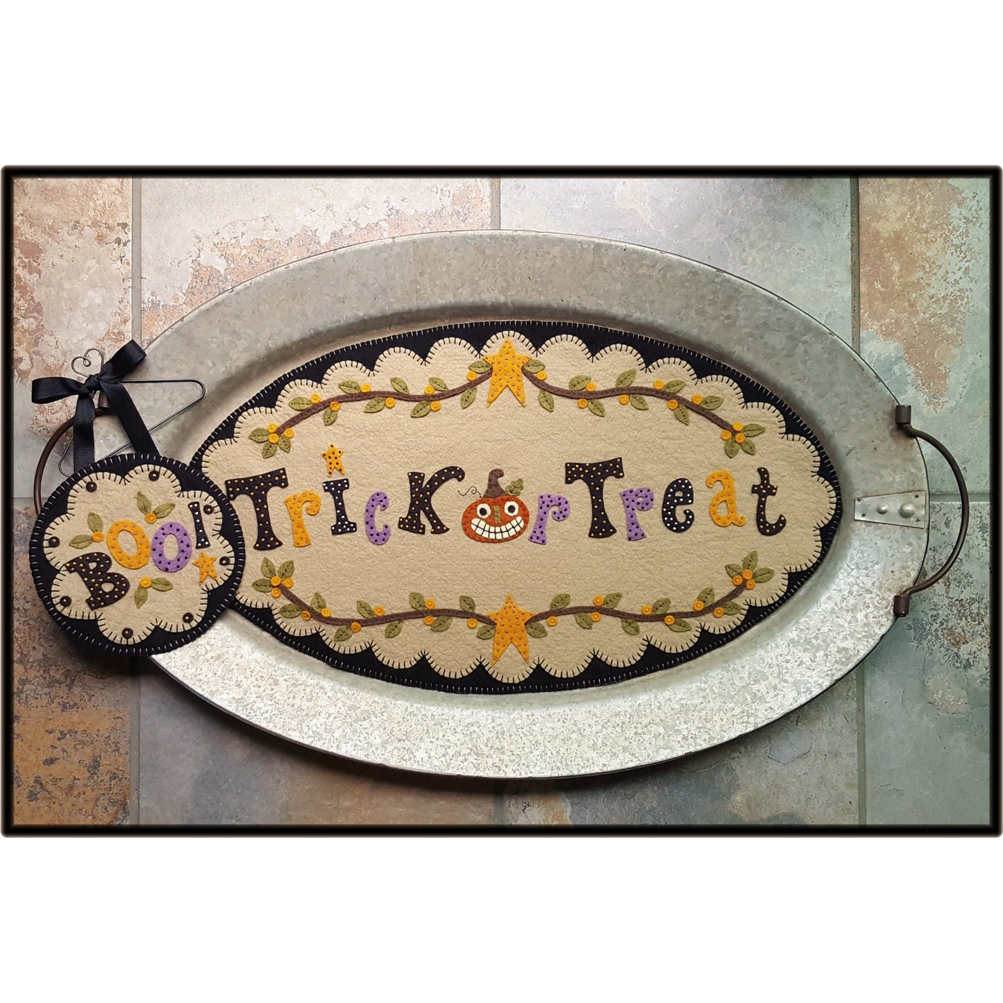 Create a fun set of 'treats' that are sure to delight and impress this Halloween! The table runner measures 12 1/2" X 22" and the 'scary' mini mat measures 6 1/2". Stitch 'em up using wool felt or wool.