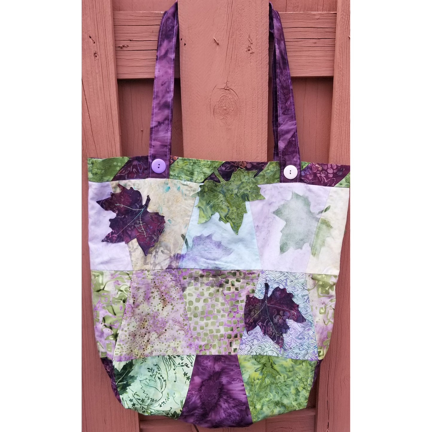 Versatile lined tote for everyday use. Pieced tumbler blocks and parallelograms make up this quick and easy project. You can choose to leave it plain or decorate it with fabric and stenciled leaves. Templates are included but is also an Accuquilt GO! friendly pattern.