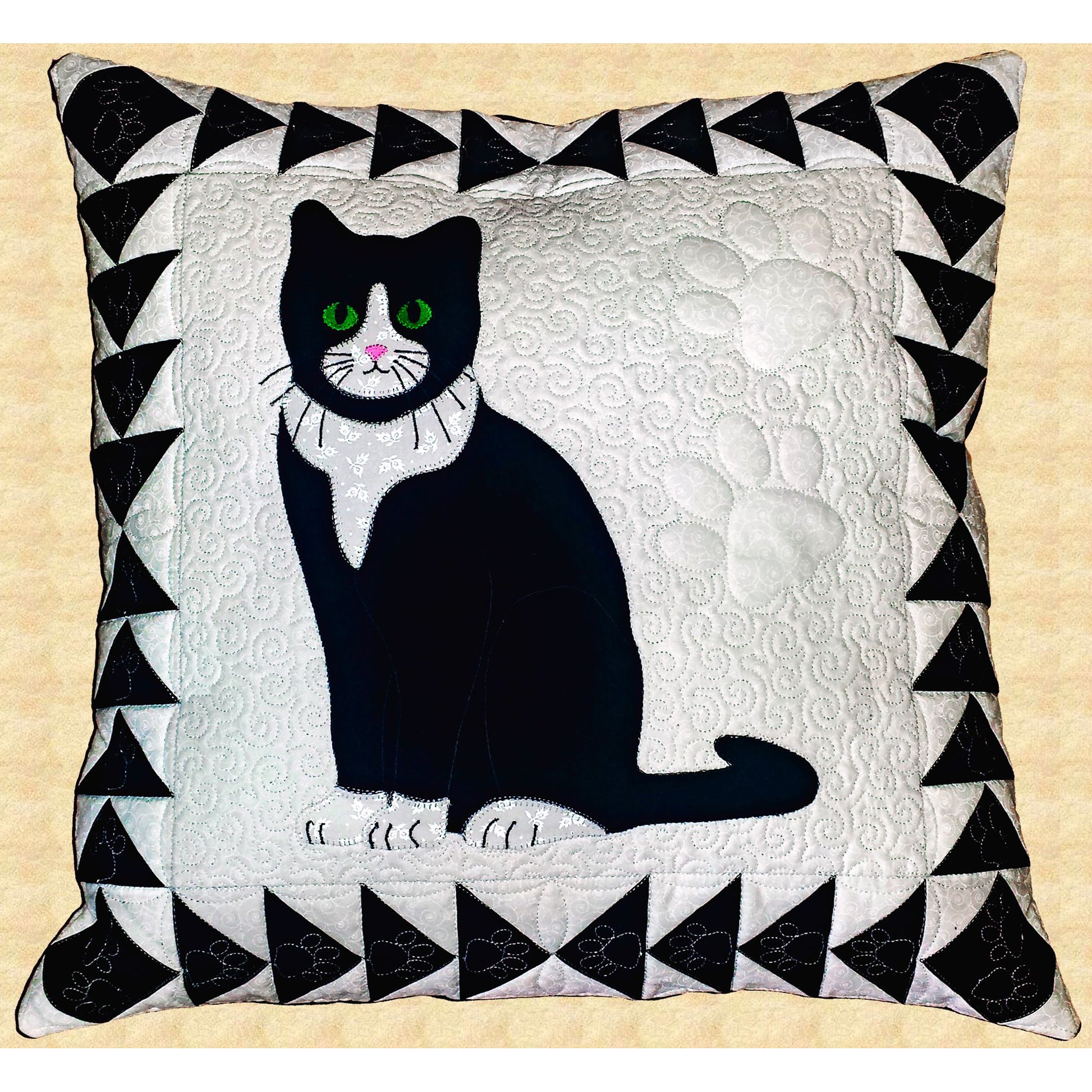 A mostly black and white pillow featuring a sitting tuxedo cat surrounded by Flying Geese blocks. Pieced and appliqued pillow pattern.Finished Size: 18" x 18"