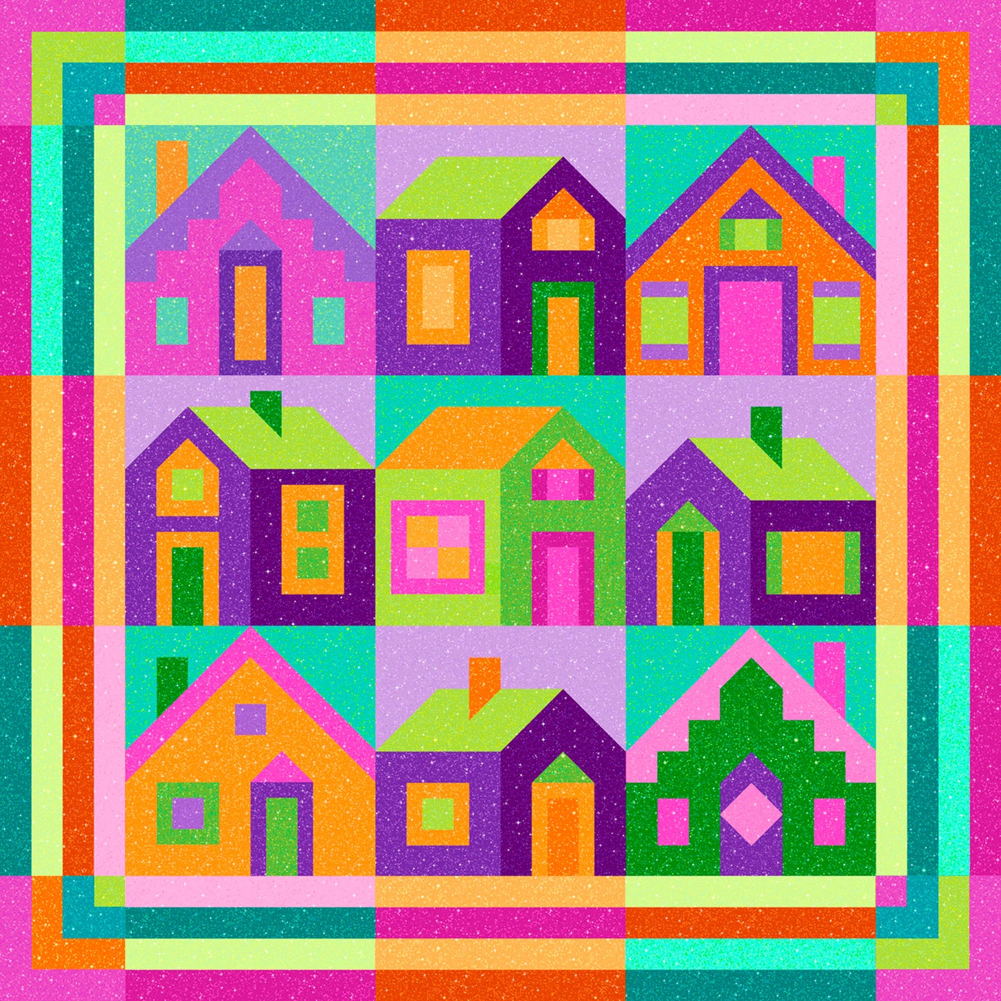 The Twinkle Town quilt pattern is a great project for House-Of-The-Month Clubs, it has 9 individual home styles. With no inset seams, just square, half-square triangles and rectangle piecing, it's straight forward to make. The pattern is also easy to customize and has lots of fun appeal.