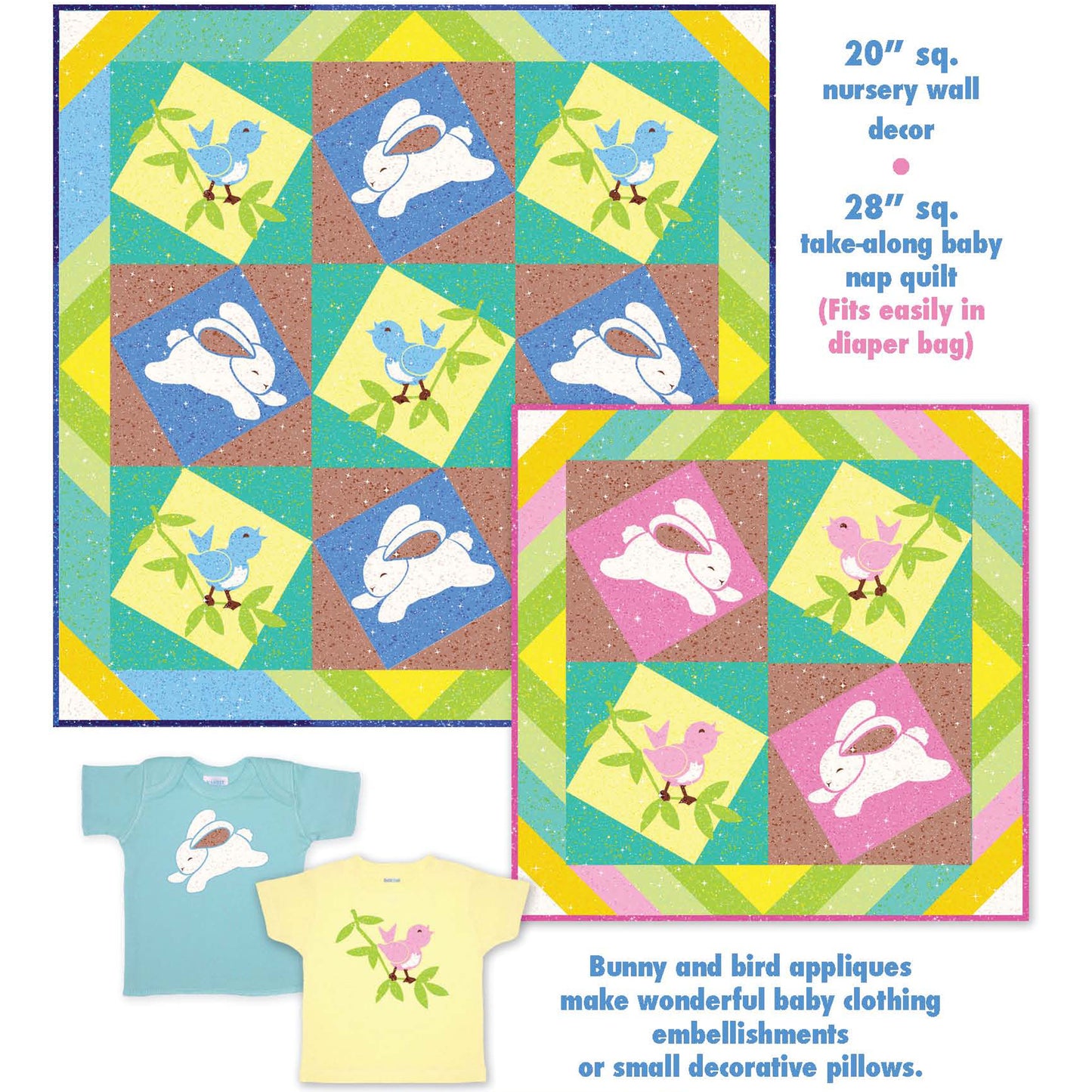 The bunny and bird appliques make wonderful baby clothing embellishments or small decorative pillows.