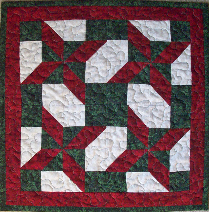 This is a small quilt pattern designed with holiday print fabric. Make it in different color schemes for year-round enjoyment.