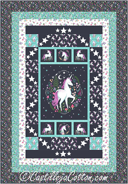 Magical unicorn quilt pattern using a 24" x 43" unicorn panel, not included. Fabric shown in the sample quilt is Northcott Fabrics Unicorn Dreams **