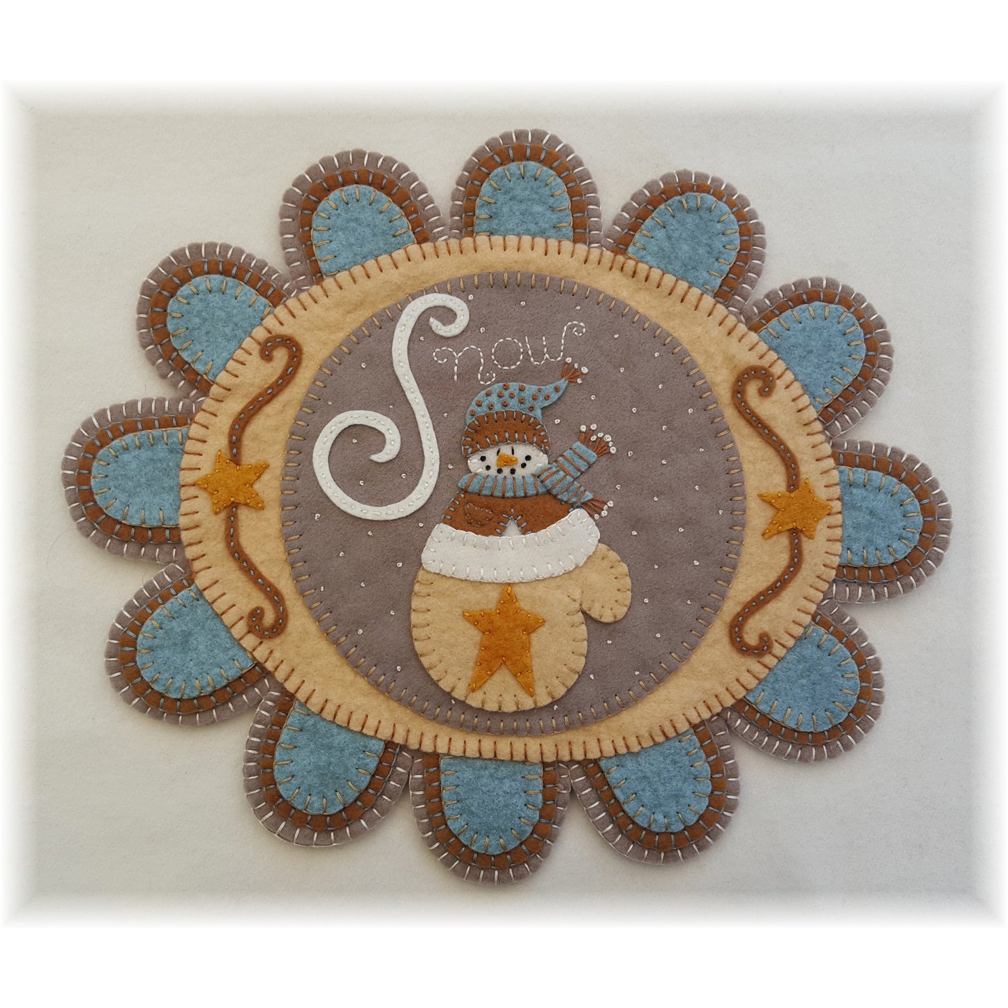 This is just the sweetest table/wall mat ever! Can you really resist the charm of this adorable snowman? This delightful design is a breeze to stitch up using wool or wool felt. The completed table mat measures 10 1/2 by 12 1/2 inches. Such a fun centerpiece for your winter table, or hang on a wall for a little charm anywhere!