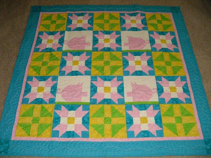 A fun piggy quilt pattern with foundation pig blocks and rotary cut alternate blocks.