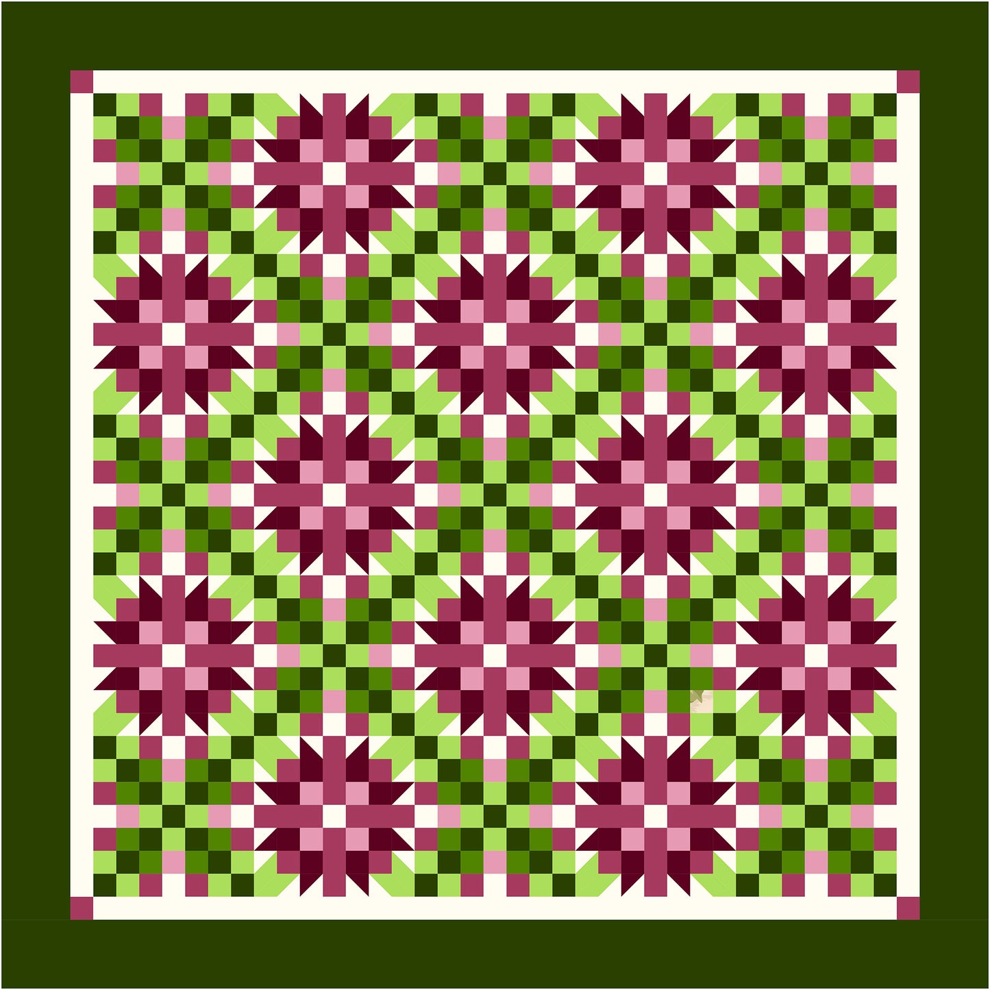 Wild Irish Rose is a perfect quilt for someone who likes all things Irish or is a fan of old musicals! This quilt blends the traditional Irish Chain motif with a Rosebud block to make a Wild Irish Rose. There are 13 Irish Chain blocks and 12 Irish Rose blocks (5 x 5 blocks). This quilt can be made larger or smaller by adding or subtracting blocks in alternating pattern.
