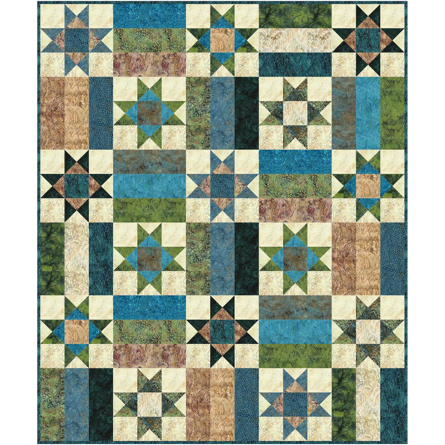 Beautiful quilt pattern alternates stars with stripes. Fabric shown in the sample quilt is Willow Creek by Island Batik. The design would be lovely with red, white, and blue fabric, too.