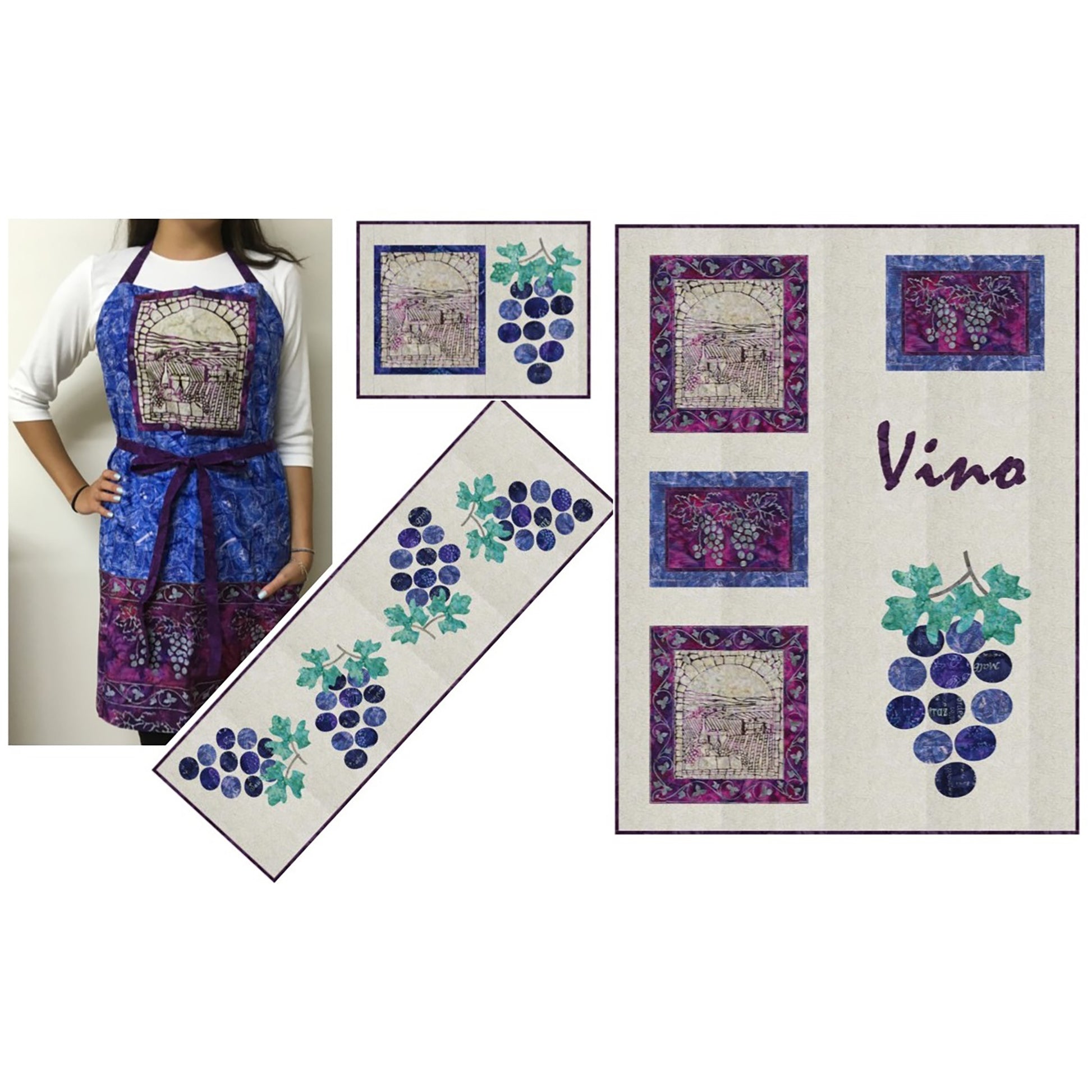 Showcase a 7 1/2 x 8 1/2" mini panel or block and a segmented border stripe such as those in Banyan Batik's Vino collection in a wine-themed decor ensemble. Pattern includes a 30" x 39 1/2" wall quilt, 12 3/4" x 16 3/4" placemats, 12 3/4" x 39" table runner and 30" x 27" wide apron. Appliques are quick-fused. Instructions for E-Z mitered borders included.