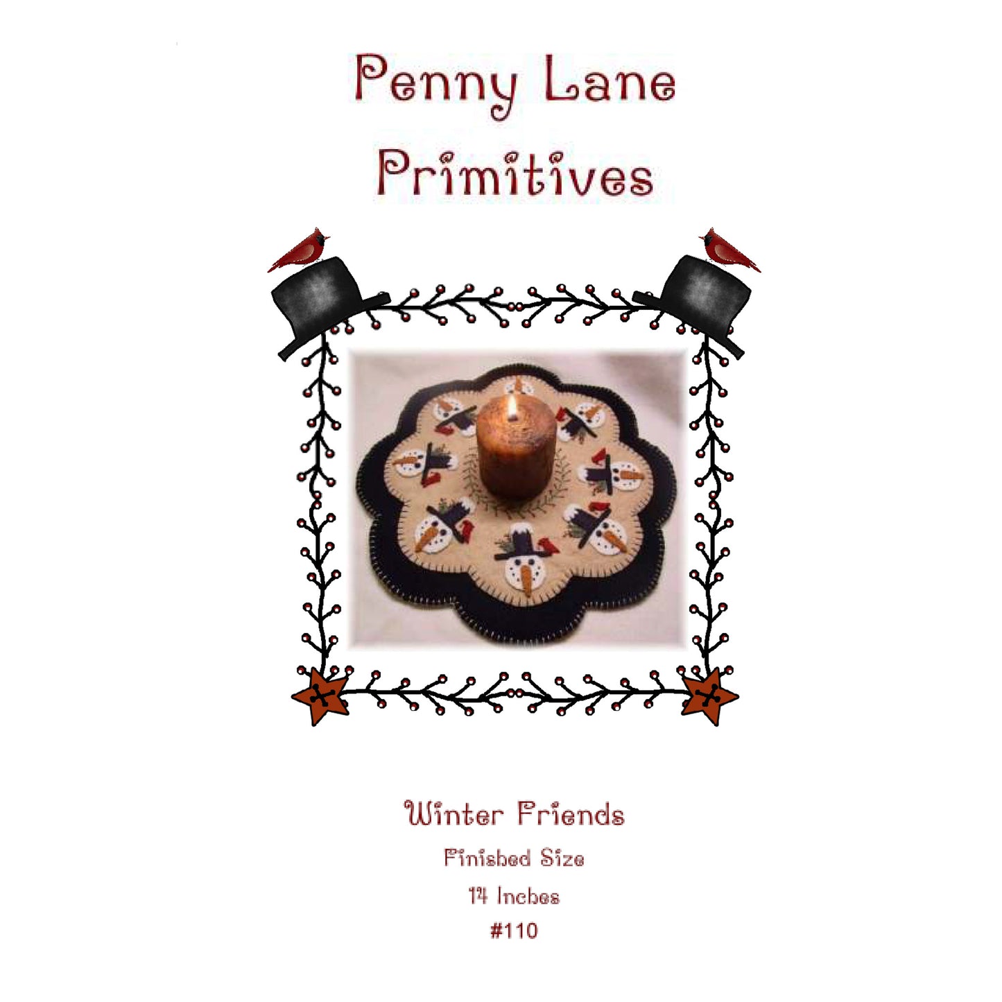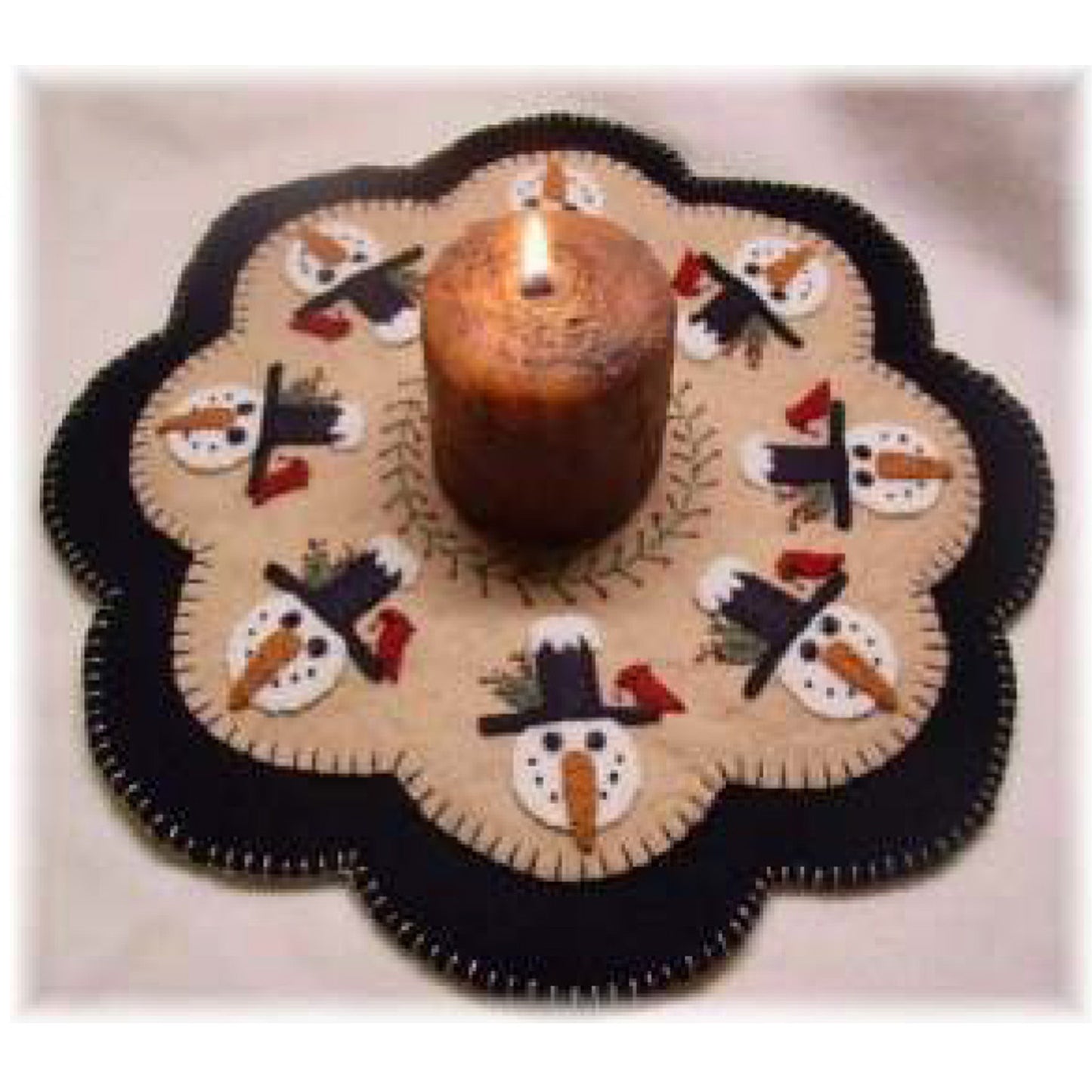 These adorable winter friends will add some sunshine to your winter decor! With his stove pipe hat, black snap eyes, and red feathered friend, this snowman candle mat pattern is sure to become a favorite winter treasure! Completed mat measures approximately 14 inches and can be made with wool or wool felt.