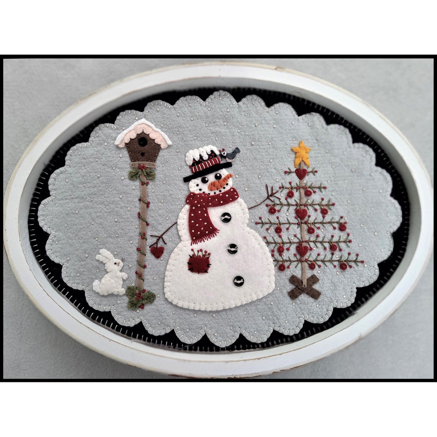 Wool applique table mat or wall hanging pattern of an adorable snowman decorating his tree.