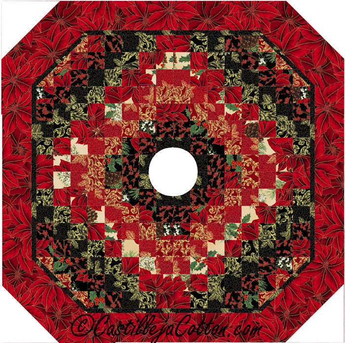 Easy to make tree skirt pattern using four 8-patch blocks. Fun bargello tree skirt pattern. Fabric line shown is Cardinal Christmas by Hoffman Fabrics.