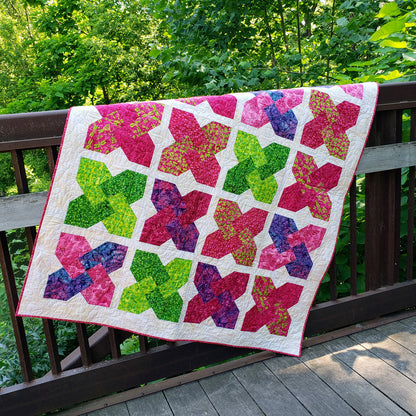 Choose contrasting medium-to-small-scale prints or solids for these clever woven kiss blocks. Thanks to stitch-and-flip techniques, the blocks are pieced using only squares. Suitable for a confident beginner, the pattern includes throw (60” x 73”), twin (66” x 93”), full (80” x 94”), queen (93” x 93”) and king (109” x 93”) sizes.
