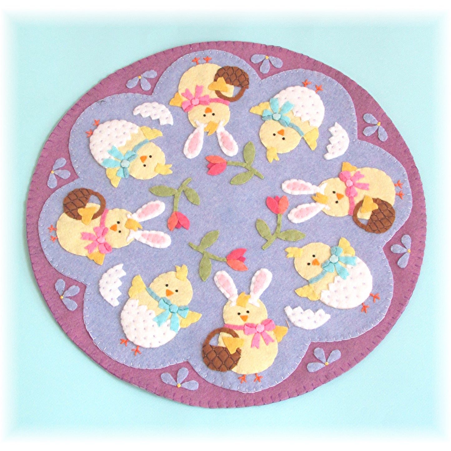 This 15" candle mat will look lovely on your tabletop this spring! It features chicks hatching & carrying baskets with their bunny ears on! Also included are templates to make smaller sized mug rugs/hotplates for your Easter table.