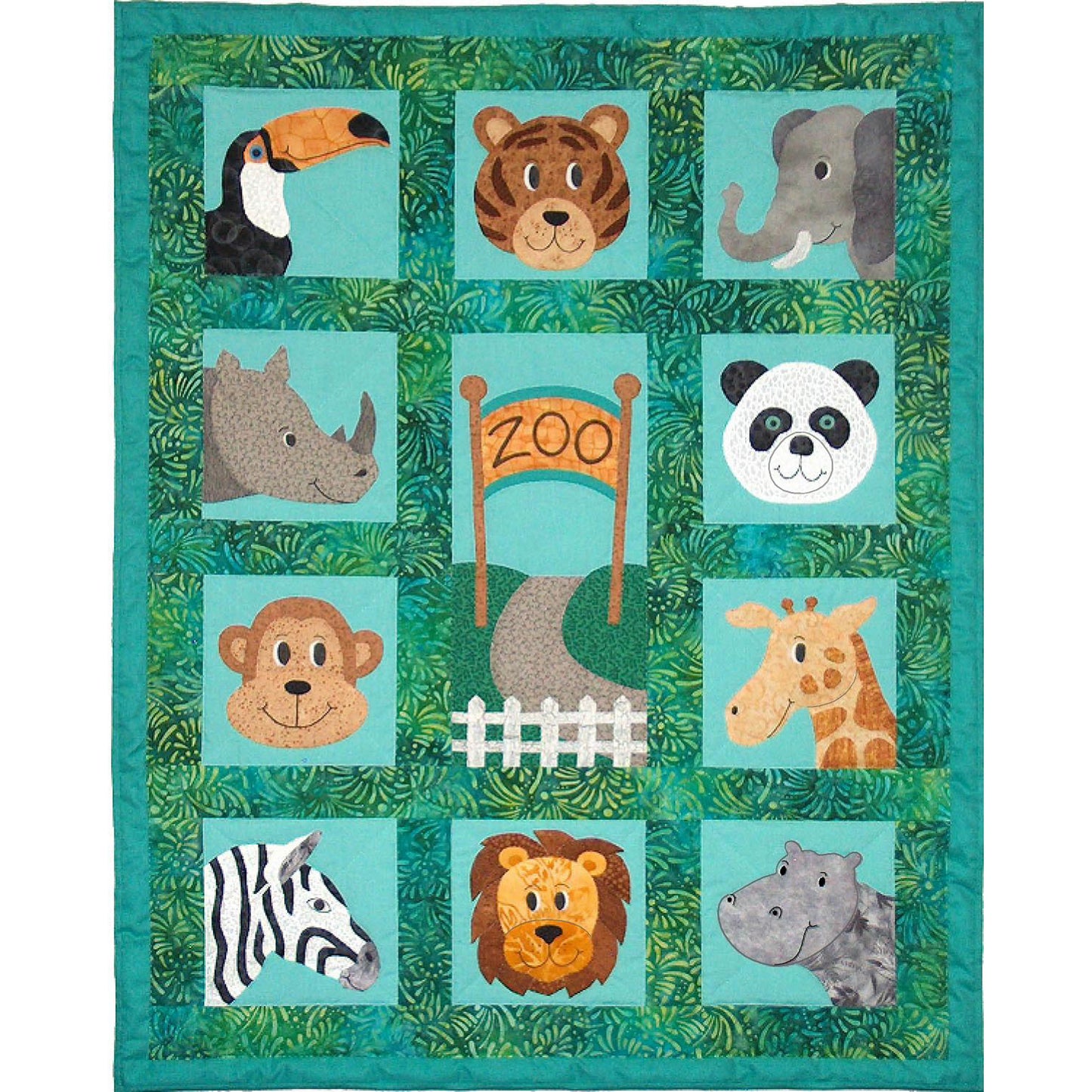 Ten zany animal faces surround the zoo entrance. Choose the border, sashing and block fabrics, then check the stash for the animal fabrics. Use as a wall quilt as shown in the photo or add additional borders for a larger crib quilt. Facial features are drawn or embroidered. Suitable for hand, machine or fusible applique. This quilt pattern is for the intermediate quilter and above.