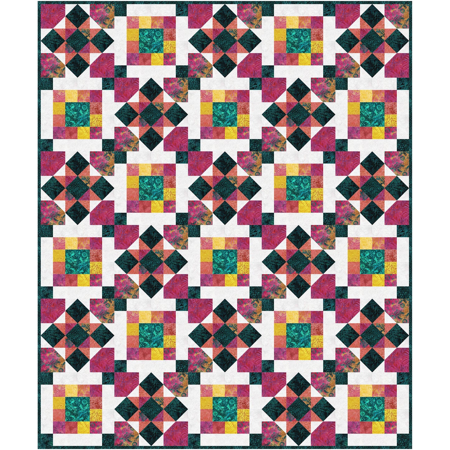 Introducing Zesty, a vibrant and fun quilt pattern from the signature collection by Raija Salomaa for Island Batiks. This design bursts with bold, lively colors that bring energy to any room. The pattern features a striking secondary design that adds depth and movement to the quilt, making it both visually captivating and dynamic.