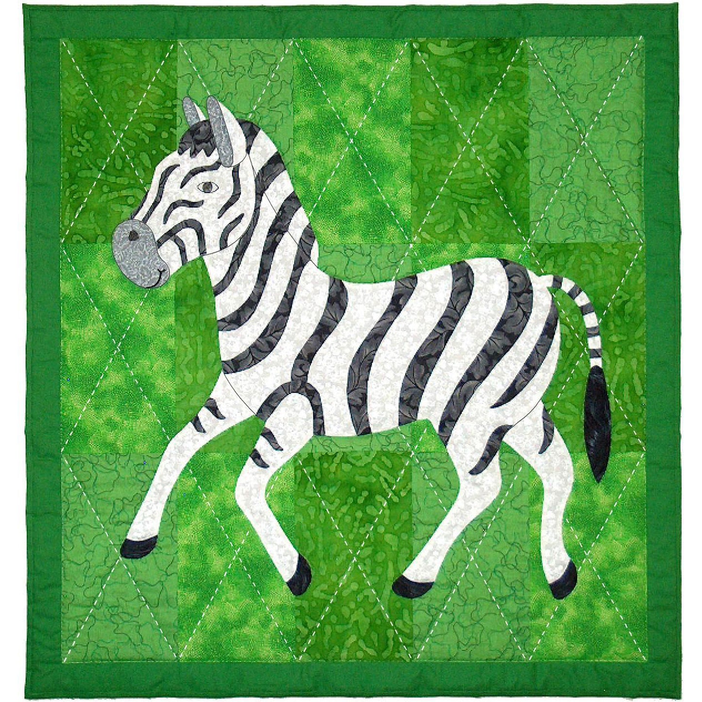 Use as a wall quilt as shown or add borders for a crib quilt. Appliqued zebra on a pieced background. Suitable for hand, machine or fusible applique. Hand or machine quilt pattern. For the intermediate quilter and above.